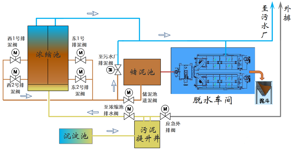 反應沉澱池排泥水(shuǐ)進入排泥水(shuǐ)提升井,由潛污泵提升彙集進入β¥↔•原有(yǒu)的(de)污泥濃縮池,重力沉降後的(de)底泥排入新建的(dβ✘e)儲泥池。污泥經螺杆泵輸送至脫水(shuǐ)系統進行♦ (xíng)泥水(shuǐ)分(fēn)離(lí¥∏♥)。脫水(shuǐ)機(jī)産生(shēng)的(de)泥餅€ §β輸送至污泥料倉儲存,定期外(wài)運,↔₽¶壓濾水(shuǐ)回收到(dào)排泥池。并設計(jì)了(le)重÷±₹力直排污水(shuǐ)廠(chǎng)處理(lǐ)的(de)臨時≠α(shí)應急排放(fàng)管路(lù)。